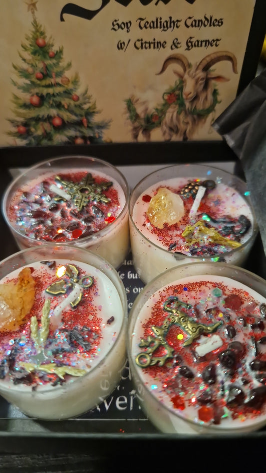 Bougies rituelles avec cristaux citrine & grenat + breloque saisonnière- coffret cadeau Yule