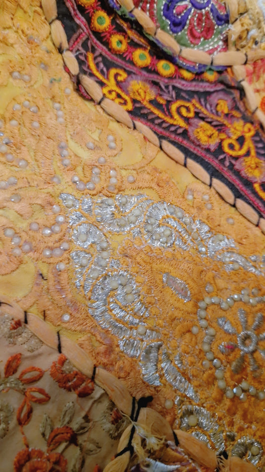 Tenture artisanale de Pondichéry – Patchwork Jaune-Orangé – Miroirs, Perles & Fil Doré – 95×150 cm – Made in India