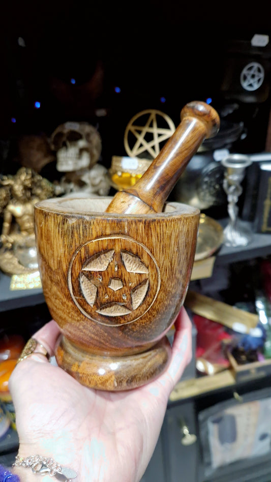 Mortier et pilon en bois avec pentacle - outil ésotérique